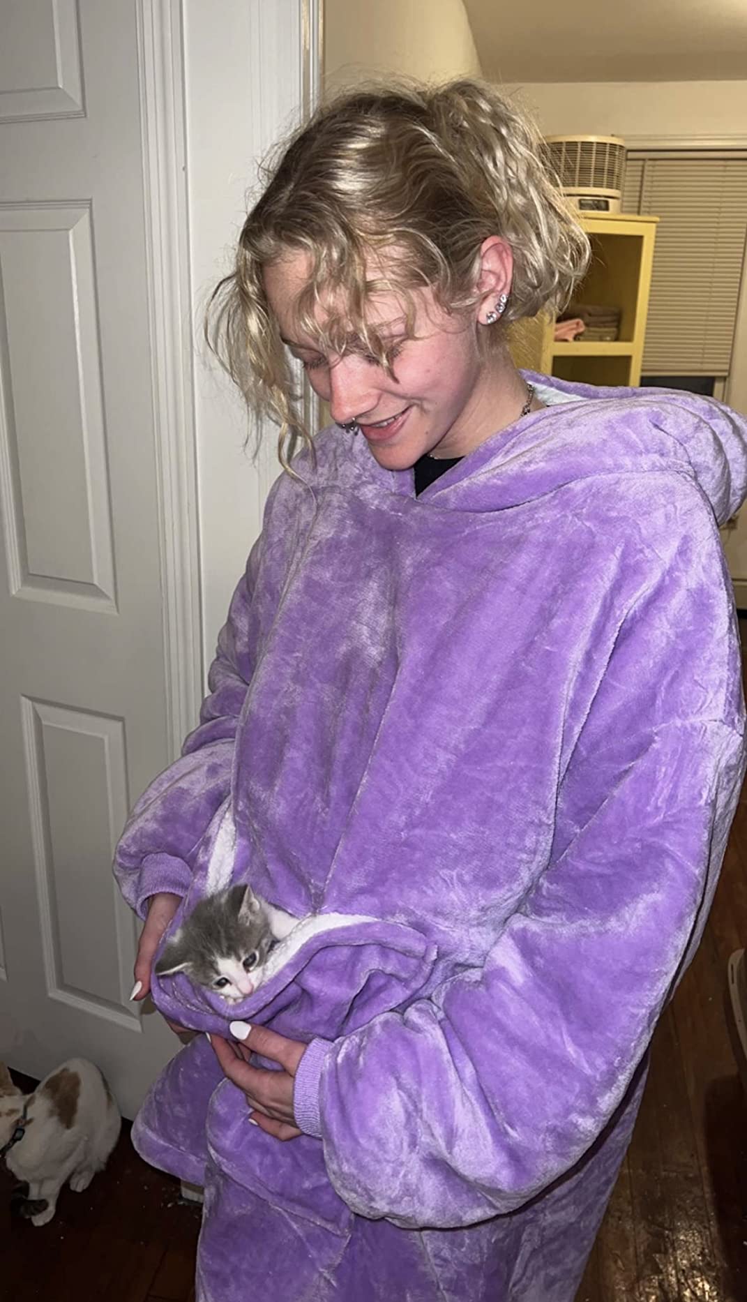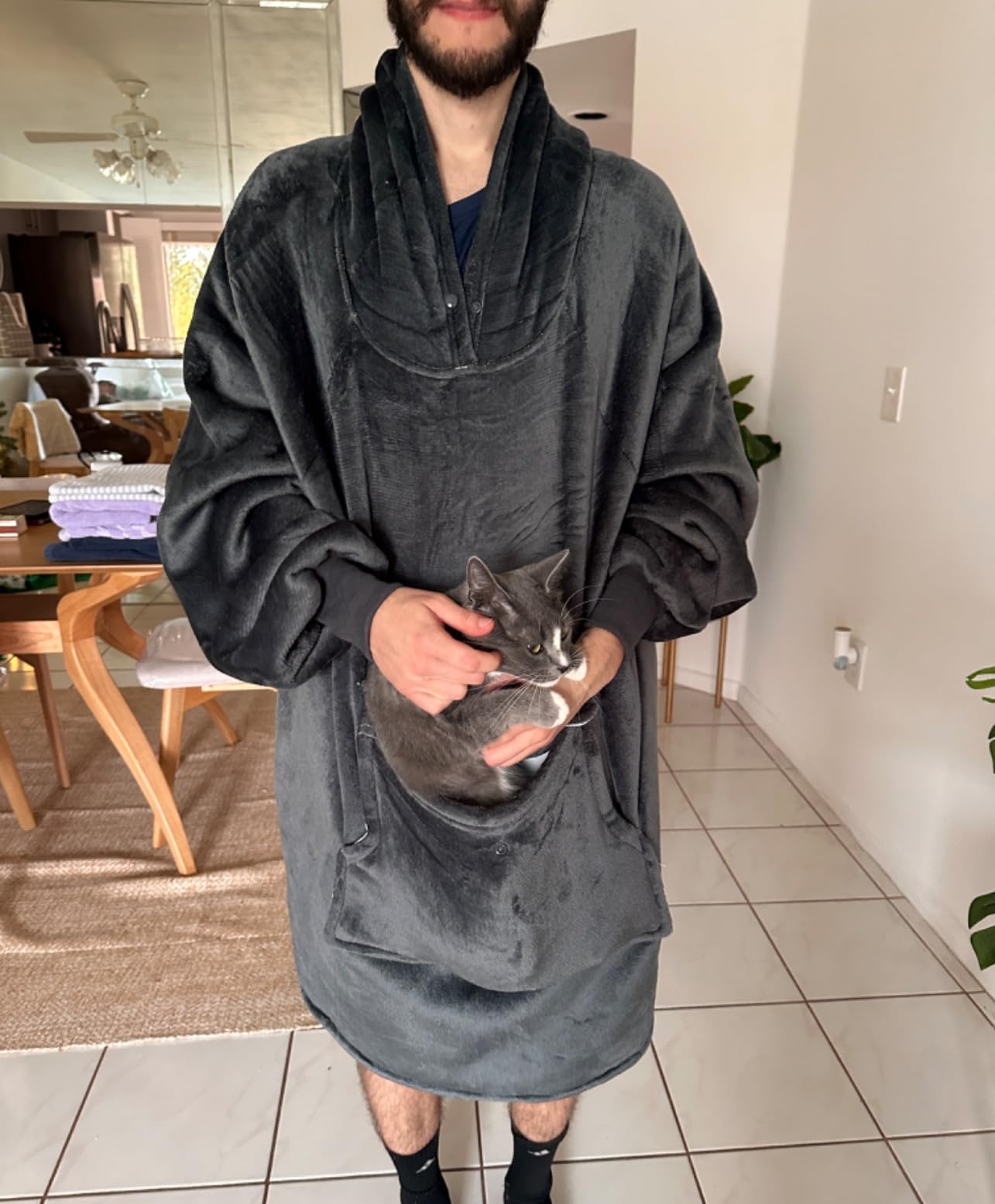 Yes, it is specifically designed to be worn like a giant sweatshirt, allowing you to walk and move around while staying fully covered and warm.